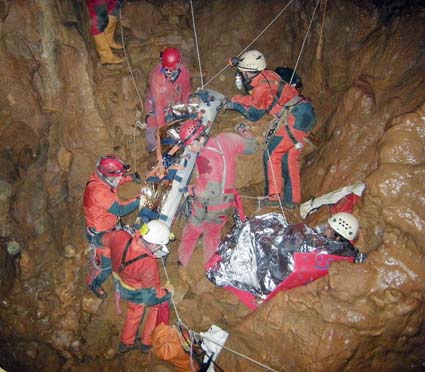 Viereinhalb Stunden dauerte es letztlich, bis alle drei Übungsopfer wieder aus der Höhle waren. Was lange erscheint, ist für die Verhältnisse eine ganz passable Zeit. Rettungsleiter Ingo Bauer dazu: „Wir mussten die Vermissten in der Höhle suchen und finden, ein Arzt versorgte vor Ort ihre Verletzungen und wir hatten bei allen dreien für Wärmeerhalt zu sorgen“. In der Tat ist Unterkühlung nach Aussagen der Fachleute eine der größten Gefahren unter Tage. Während der medizinischen Versorgung sicherten Seiltechniker den Transportweg der Rettungstrage aus 40 Meter Tiefe hinauf zum Eingang, Kommunikationsspezialisten bauten eine Telefonverbindung zwischen der Einsatzleitung und dem Unfallort auf.